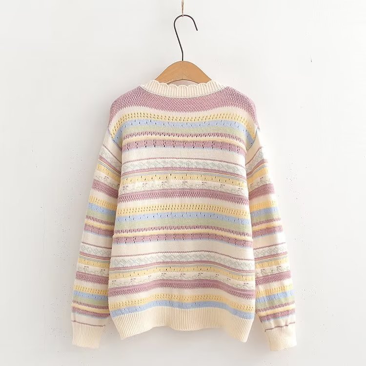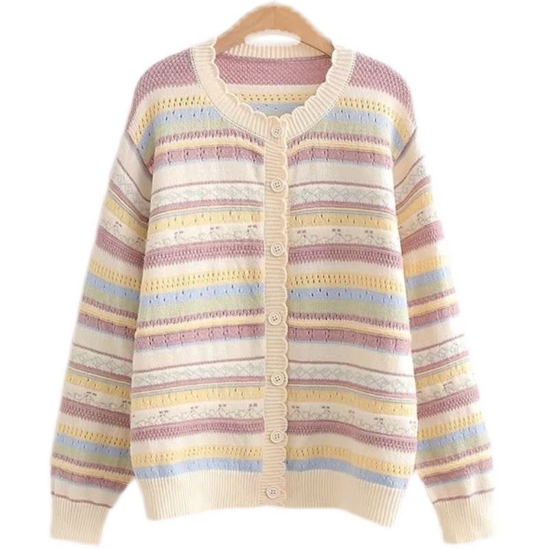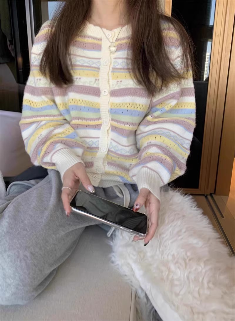 New style gentle style college style sweet knitted cardigan female hollow jacquard striped sweater short coat