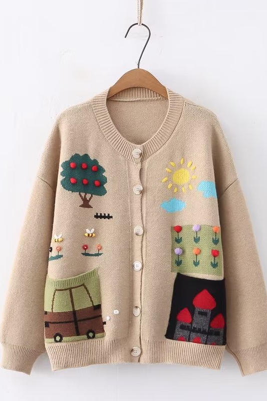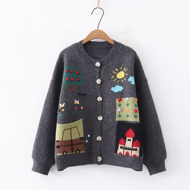 Cute Bear Jacquard Green Knit Cardigan Sweater