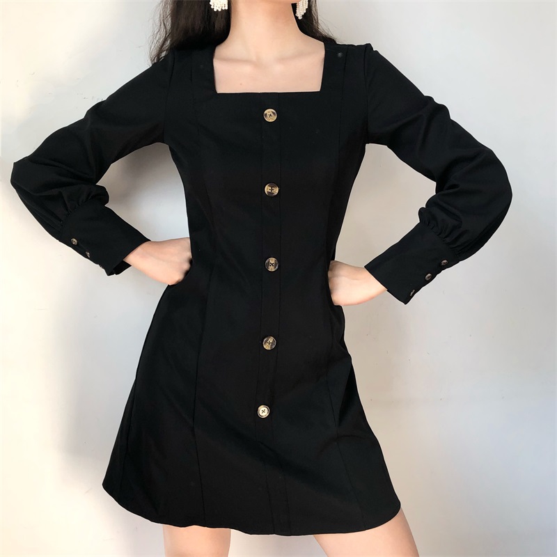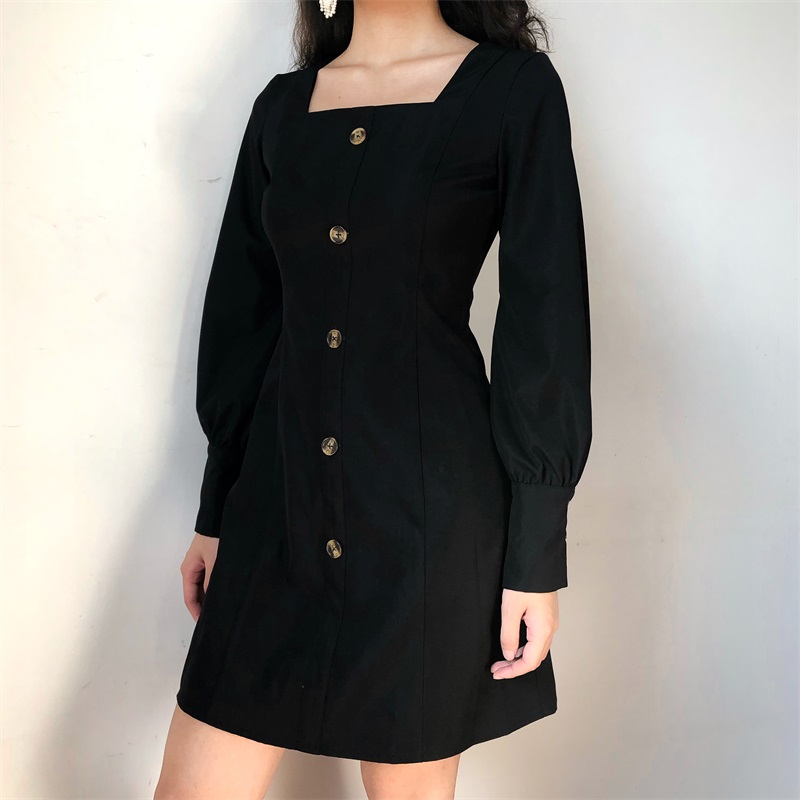 Fashion cute retro square collar single-breasted black dress