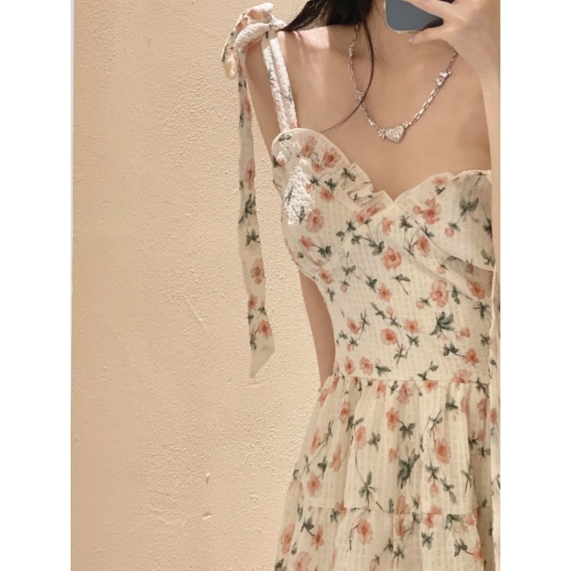 Retro Sweet Bandage Waist Floral Suspender Dress