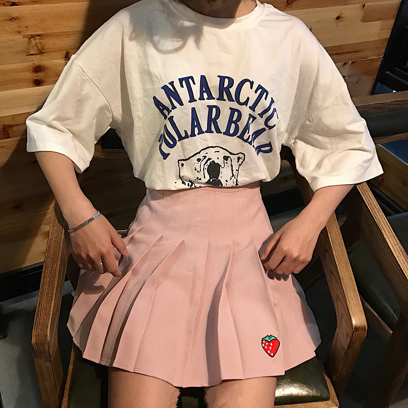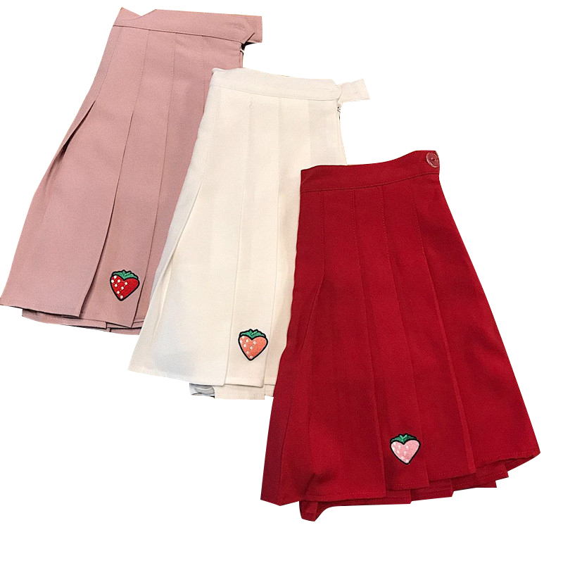 Harajuku Strawberry Embroidered High-waist Pleated Skirt