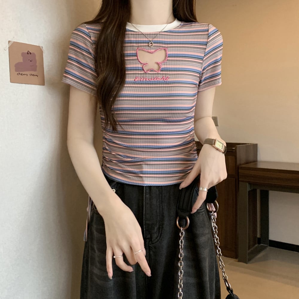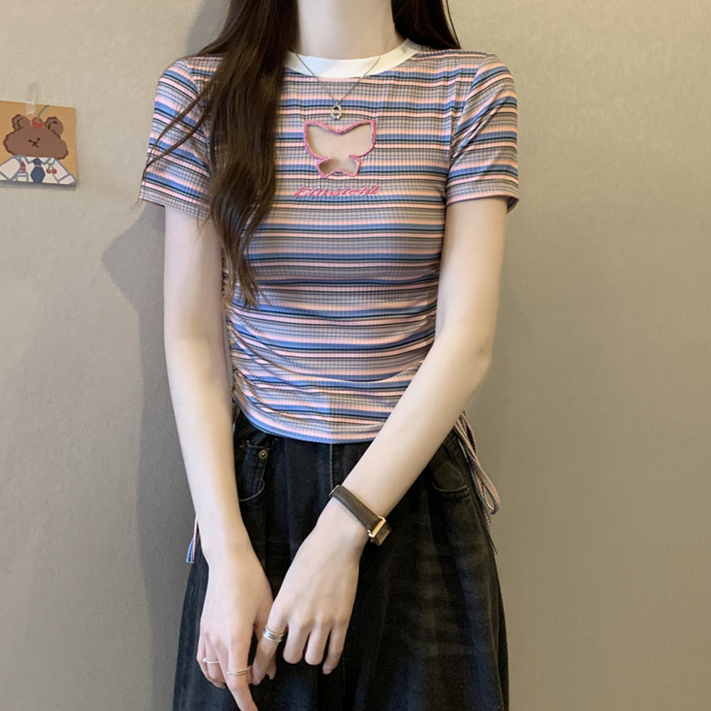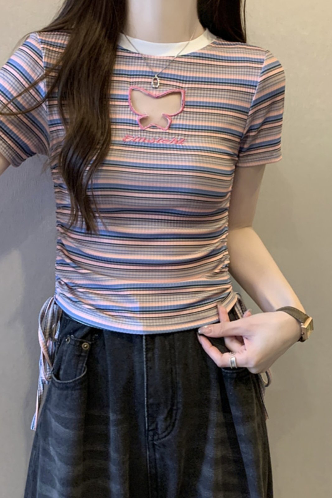 New Summer Hollow Butterfly Stripe Short Sleeve T-Shirt