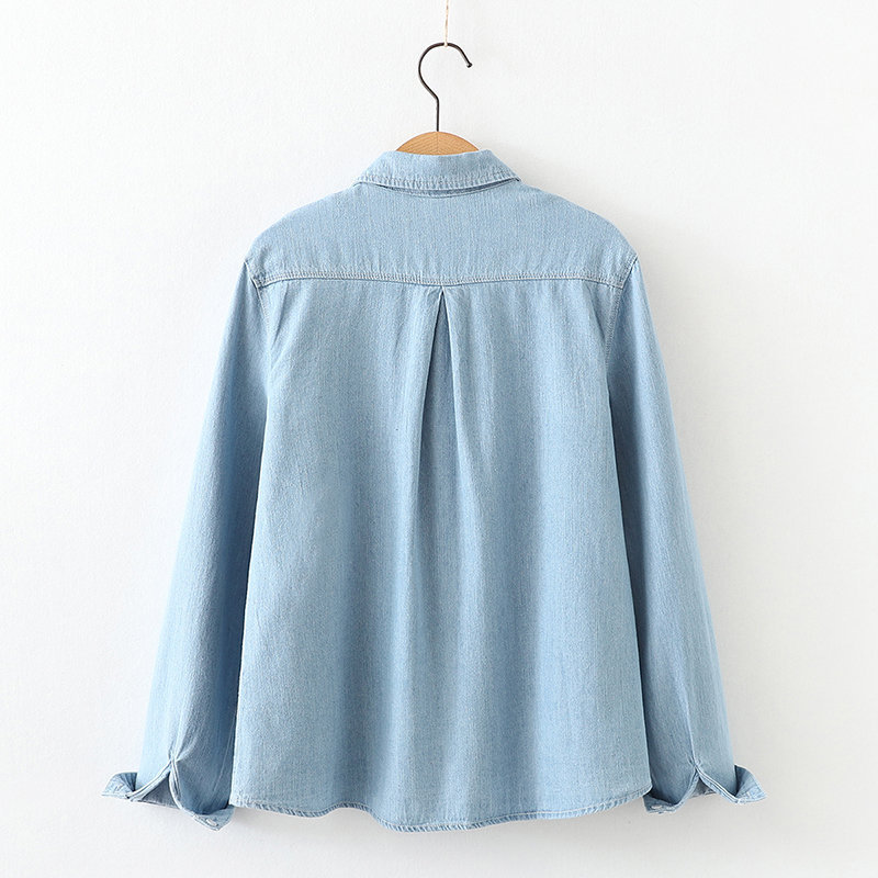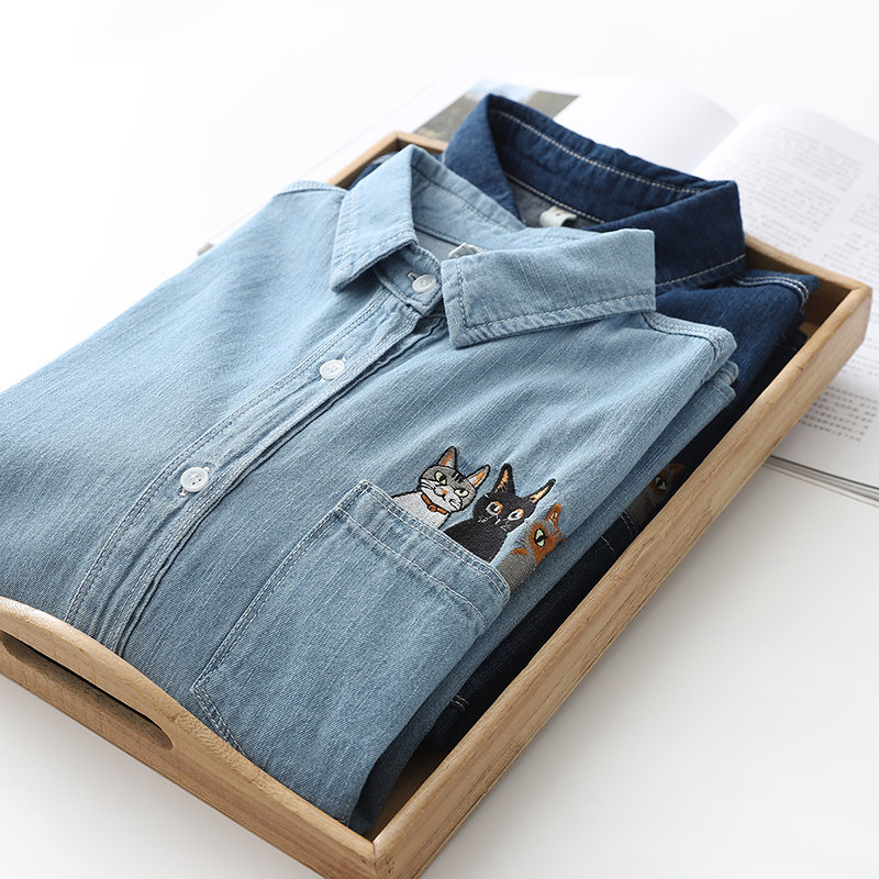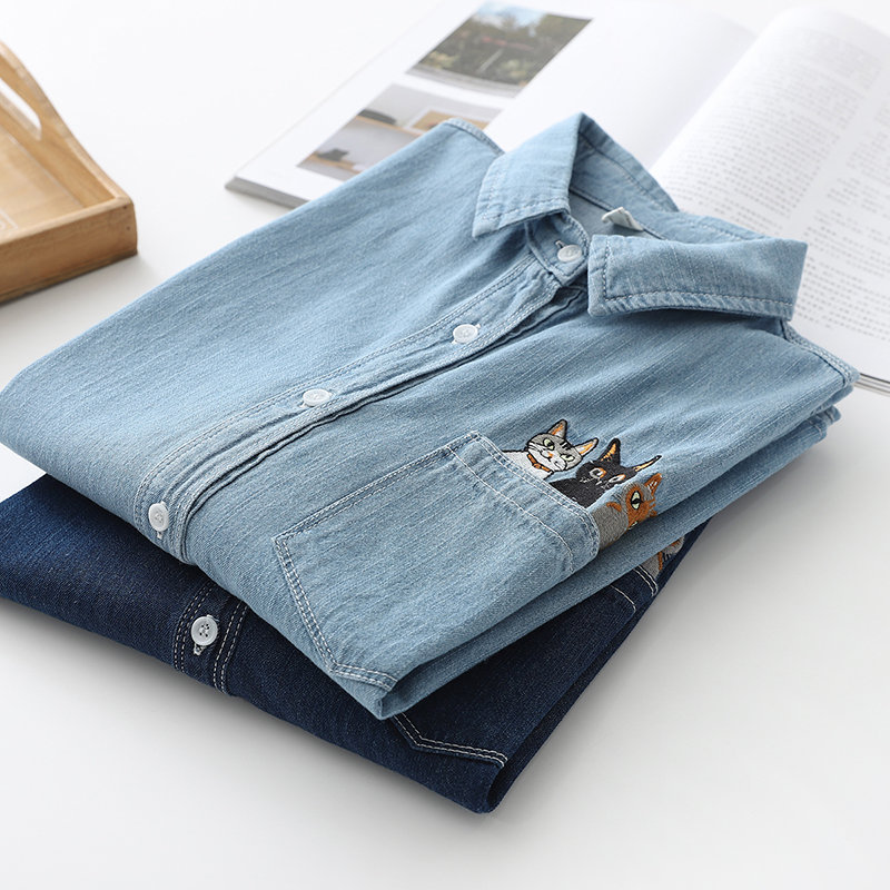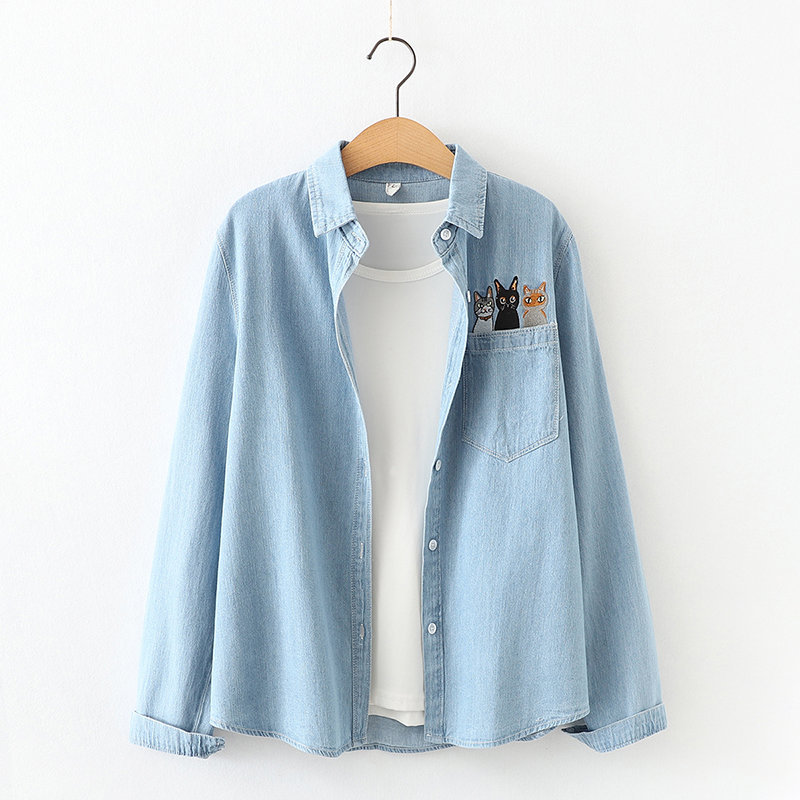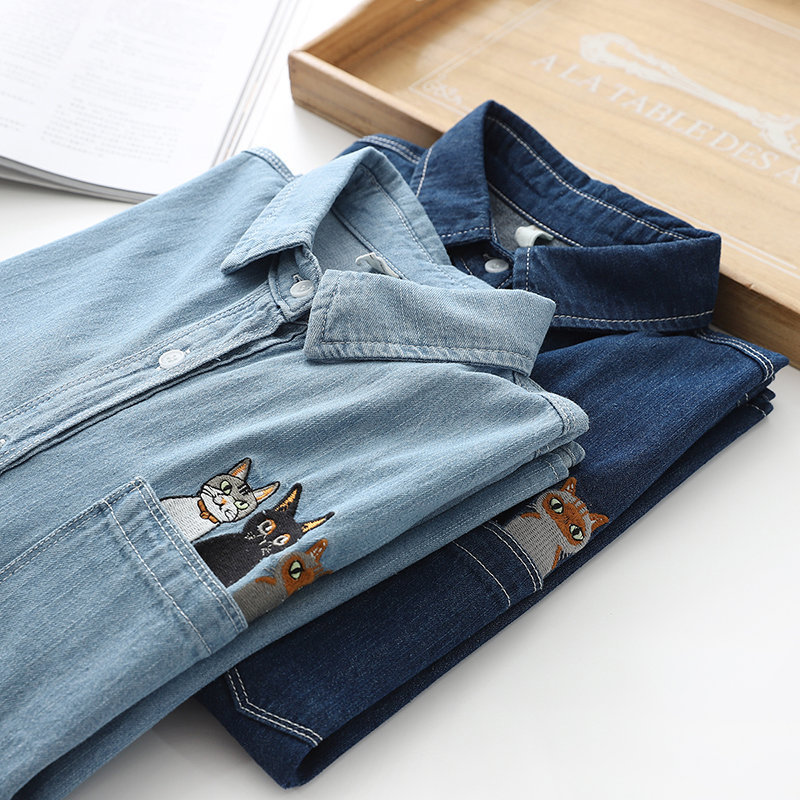 Cute cartoon pocket embroidery cat washed denim long sleeve blouses
