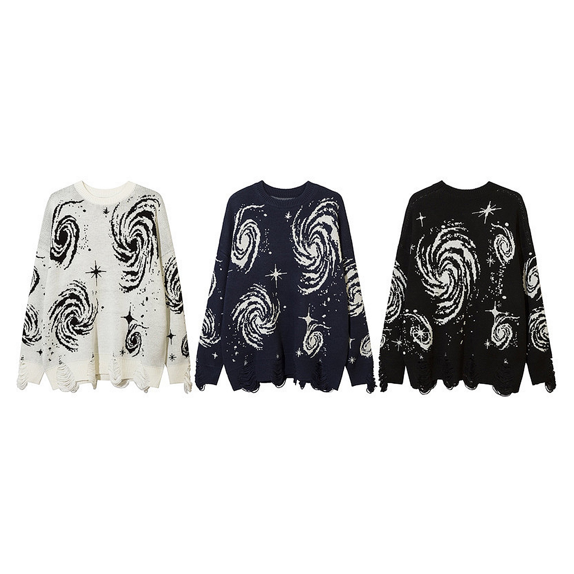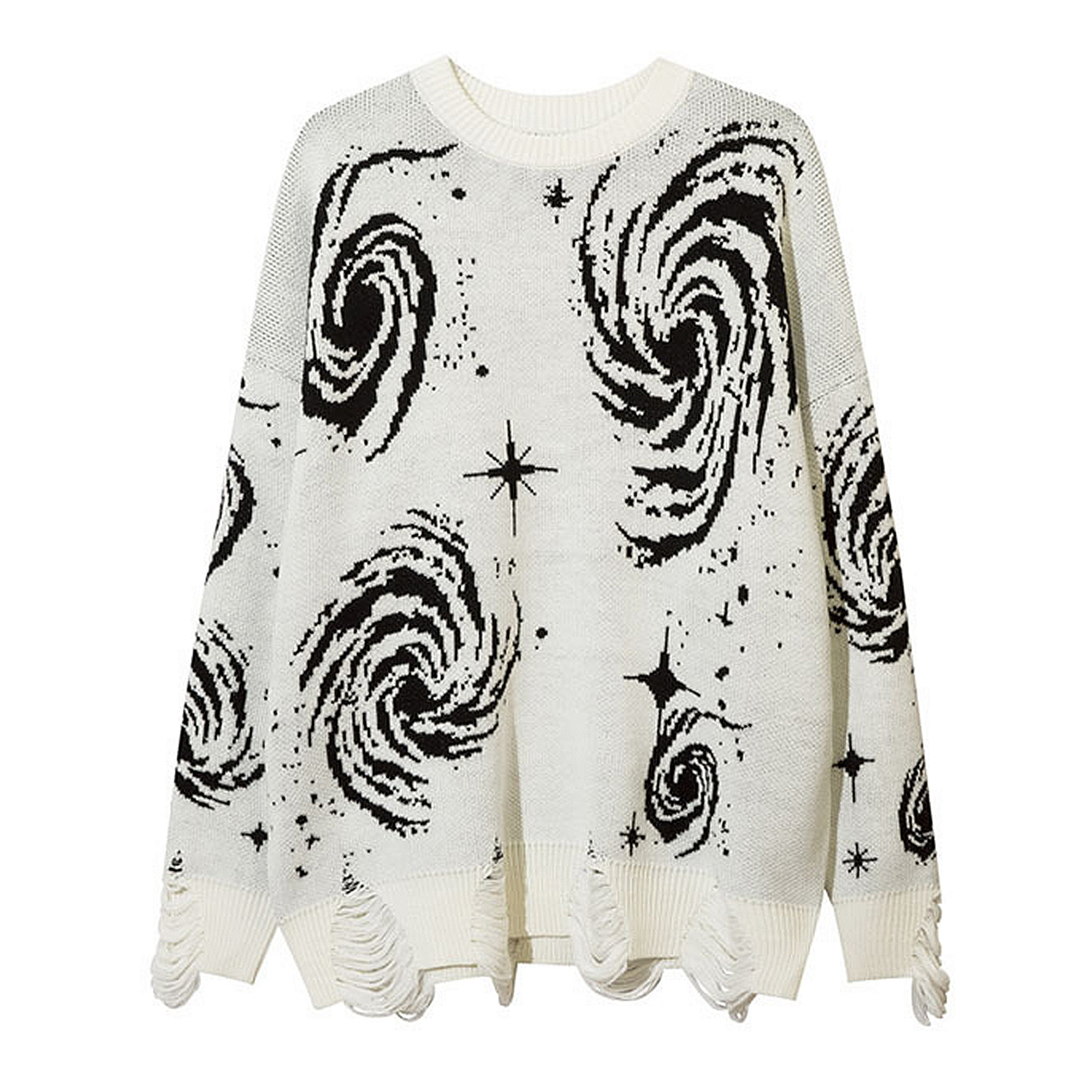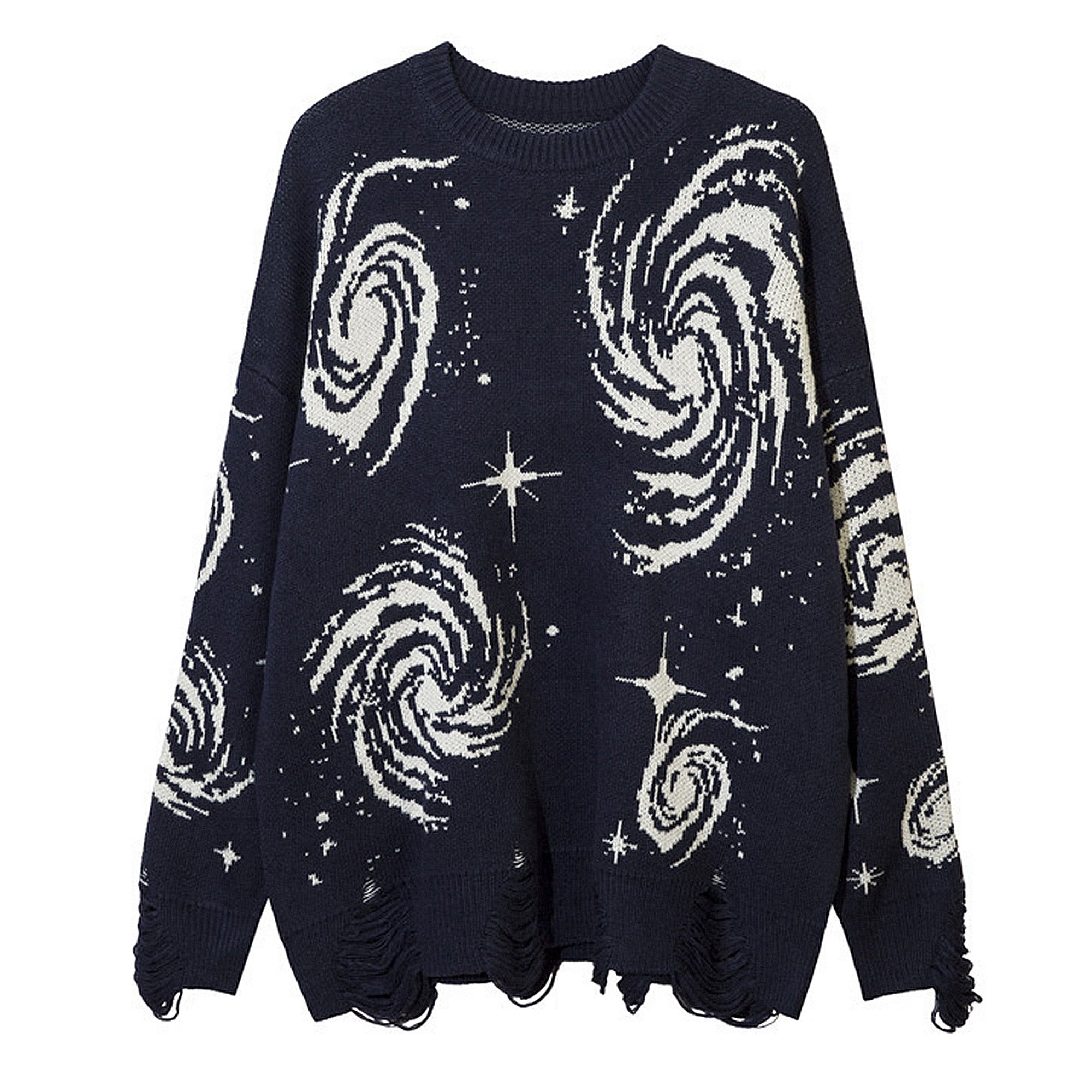 Y2K vintage pleated vortex knit, cosmic galaxy print loose ripped sweater
